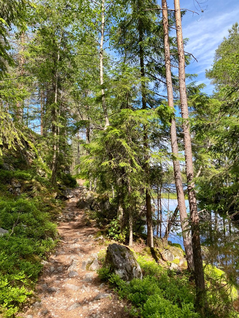 Eventually dragging myself away, I carried on towards Skjennungstua, passing another lake and winding uphill through the pines. This “sports cabin” is located on a high point with views out over the forest and while already quite large, it was being renovated while I visited so should be even bigger and better. A little early for lunch and not yet ready to move on from my pastry, I grabbed a smørbrød, a Norwegian open sandwich made with various toppings on a single slice of buttered rye bread, and continued towards Ullevåseter Sportsstue. From here I took the more rugged trail to Sognsvann. Until this point I had been on wide, well-maintained trails used by hikers and cyclists (as well as trail running parents pushing prams up and down hills and, of course, dog walkers), so it was a pleasant change to be on a narrower trail. Dodging roots, skipping over rocks through running water and avoiding muddy patches, I felt like I was actually “hiking” in a more secluded section of the forest. If this is not your cup of tea, there is another option like the other trails that also heads to Sognsvann.